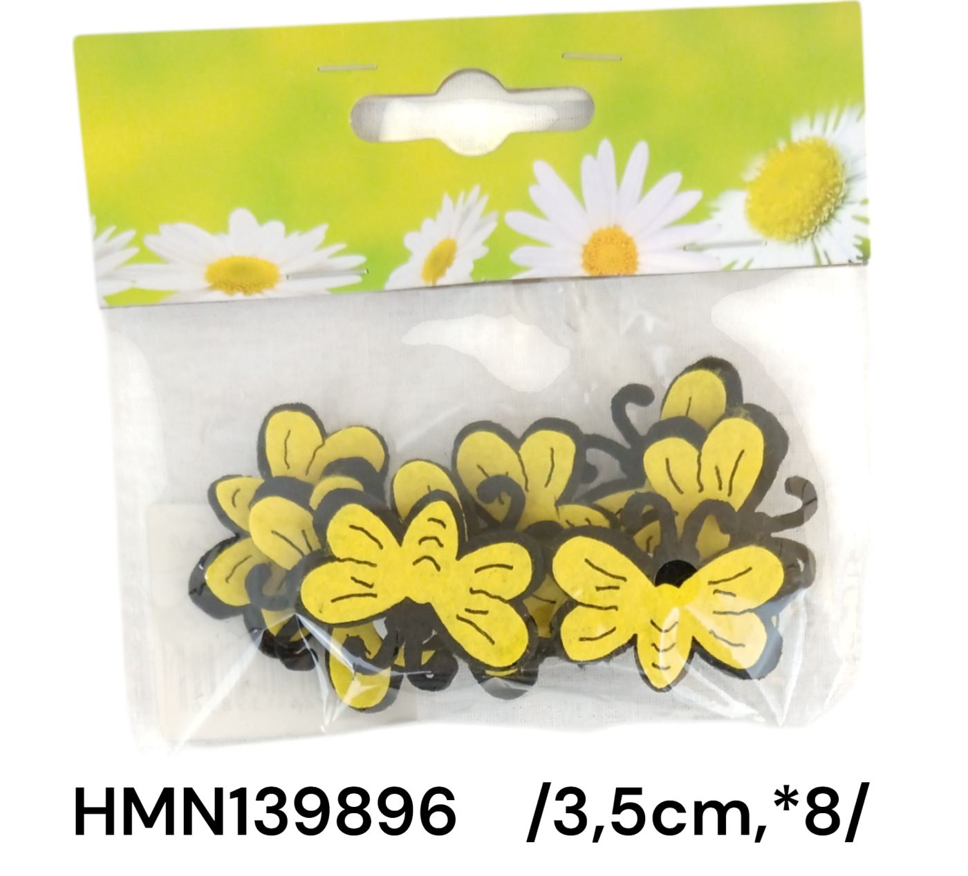 Adauga o nota vesela creatiilor tale florale cu aceste albine decorative din fetru, perfecte pentru ornamente variate. Albinele sunt realizate din fetru moale si dispun de o parte autoadezivă pentru o aplicare ușoară. Fiecare pachet include opt albine, fiecare având o lungime de 3,5 cm, ideale pentru a adauga un strop de culoare și naturalețe în aranjamentele tale.