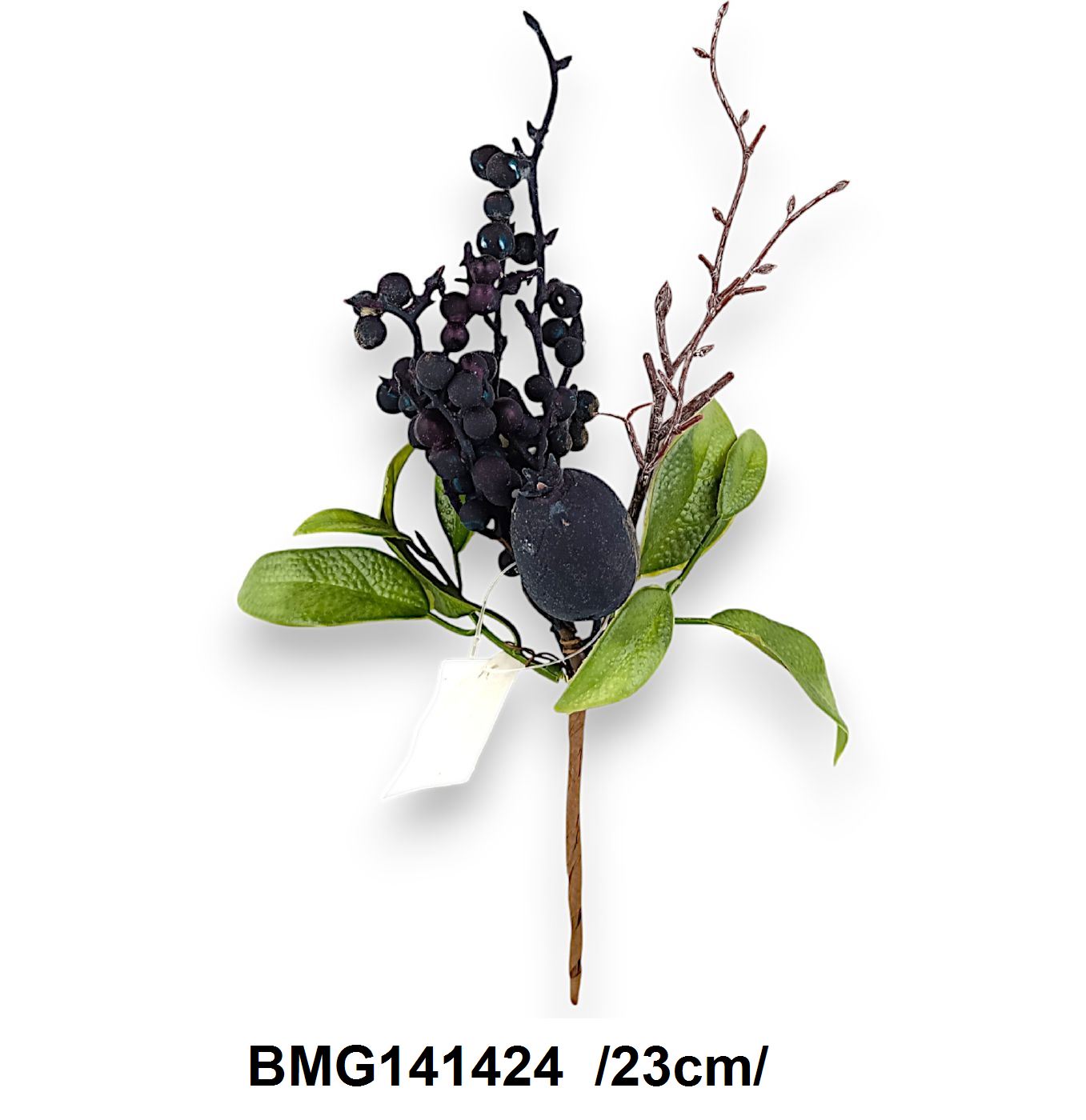 Acest buchet decorativ este ideal pentru a adăuga un strop de natură și eleganță oricărui spațiu. Compus din fructe de culoare întunecată și frunze verzi, acest aranjament aduce un contrast vizual plăcut și un element rustic decorului.