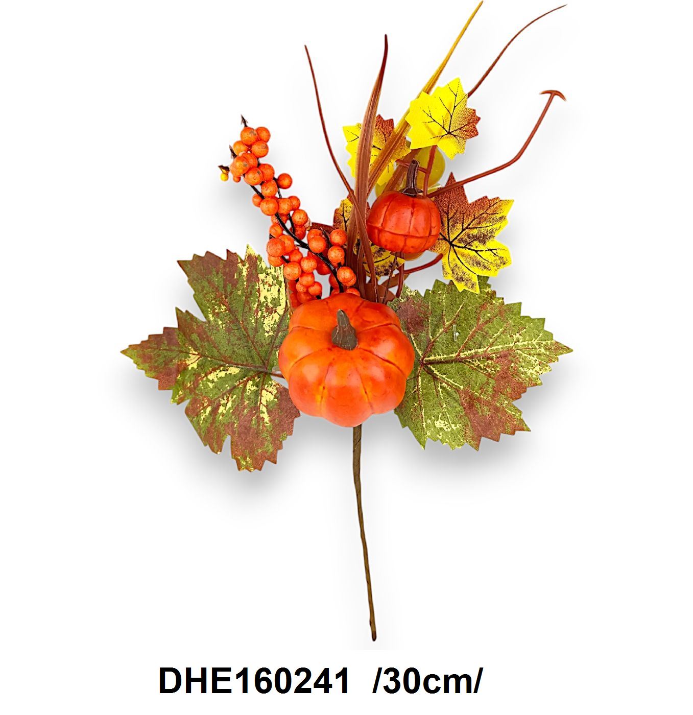 Adaugă un strop de culoare toamnei tale cu acest aranjament de 30 cm. Compoziția vibrantă include frunze detaliate în nuanțe de orange și verde, complementate de dovlecei miniaturali și boabe roșii. Perfect pentru decorul de sezon sau ca un cadou captivant.