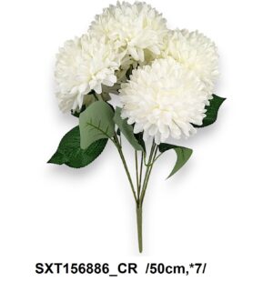 Aranjament floral artificial ce imită cu fidelitate crizantemele, realizat din materiale de înaltă calitate. Buchetul include trei capete generoase de flori în nuanța crem, ideal pentru decoratiuni interioare sau evenimente. Dimensiune: 50 cm.