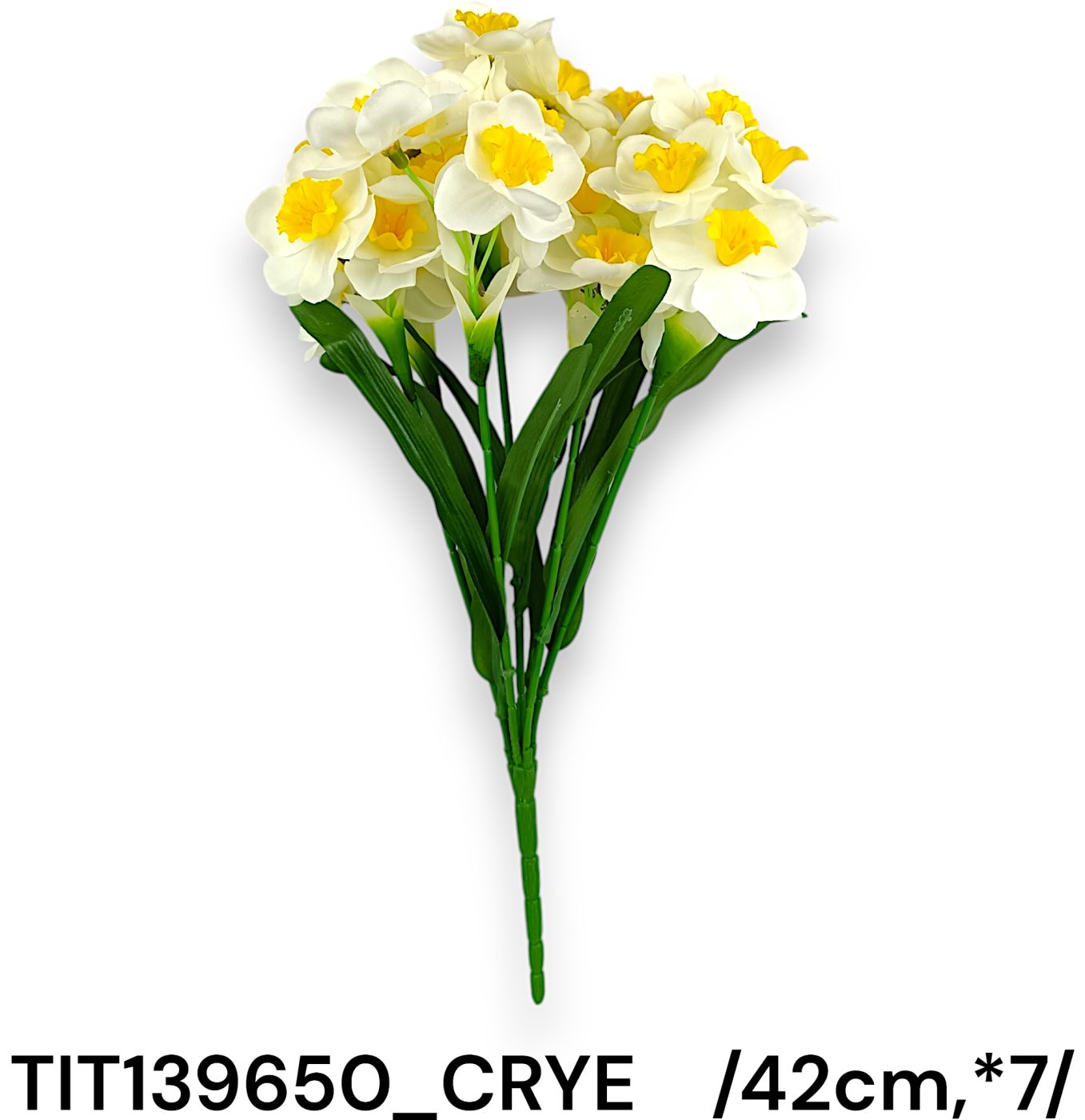 Adaugă un strop de eleganță în decorul tău cu acest buchet artificial de narcise. Buchetul este aranjat în formă oblongă, prevăzut cu frunze verzi ce completează frumos florile în nuanțe de crem și galben.