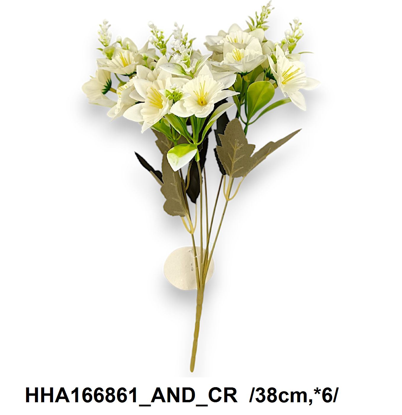 Acest buchet artificial adaugă o pată de eleganță și rafinament oricărui decor, fiind compus din flori delicate în culoarea crem. Perfect pentru aranjamente interioare, buchetul măsoară 38 cm în înălțime.