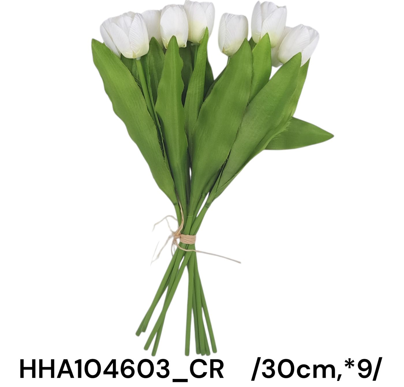 Descoperă delicatețea și eleganța acestui buchet format din 9 lalele artificiale cu capete închise, completat de frunze verzi naturale. De 30 cm înălțime, buchetul în culoare crem este ideal pentru a aduce un suflu proaspăt și liniștitor în orice spațiu, fie că este vorba de o locuință, birou sau chiar ca element central în diferite aranjamente florale.
