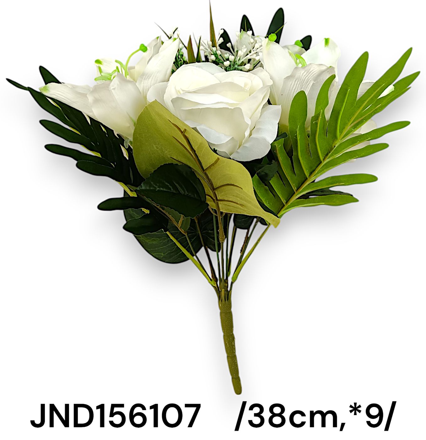 Descoperiți un buchet rafinat de flori artificiale, compus din rotițe elegante de trandafiri și crini grațioși, îmbogățit cu frunze mari verzi. Textura fiecărei flori reflectă un nivel înalt de detalii, iar nuanța crem a petalelor adaugă un strop de eleganță și sobrietate oricărui decor. Perfect pentru a fi folosit în aranjamente florale variate sau ca decor central în livinguri, birouri sau la evenimente speciale.
