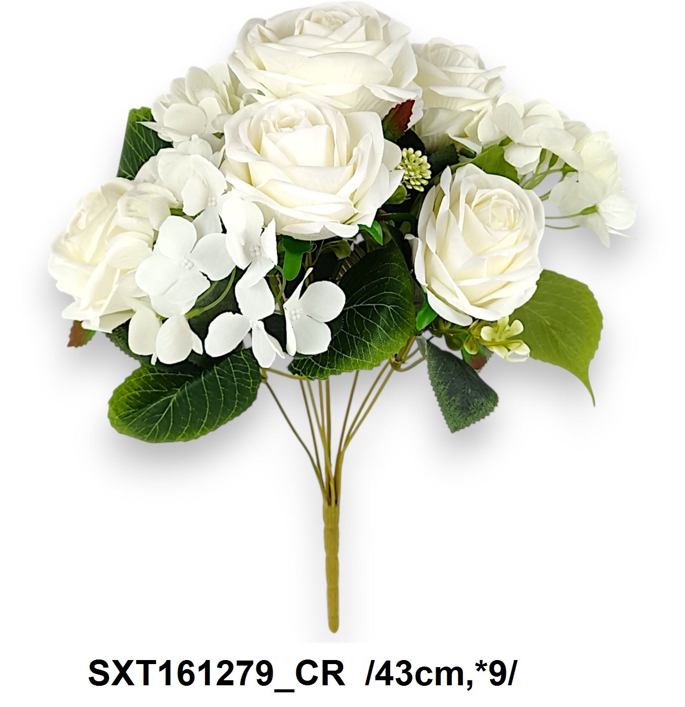 Buchet elegant de flori artificiale, perfect pentru decorul interior sau evenimentele speciale, compus din trandafiri și hortensii în culoarea crem, cu frunze verzi pentru un contrast natural. Dimensiune aproximativă: 43 cm.