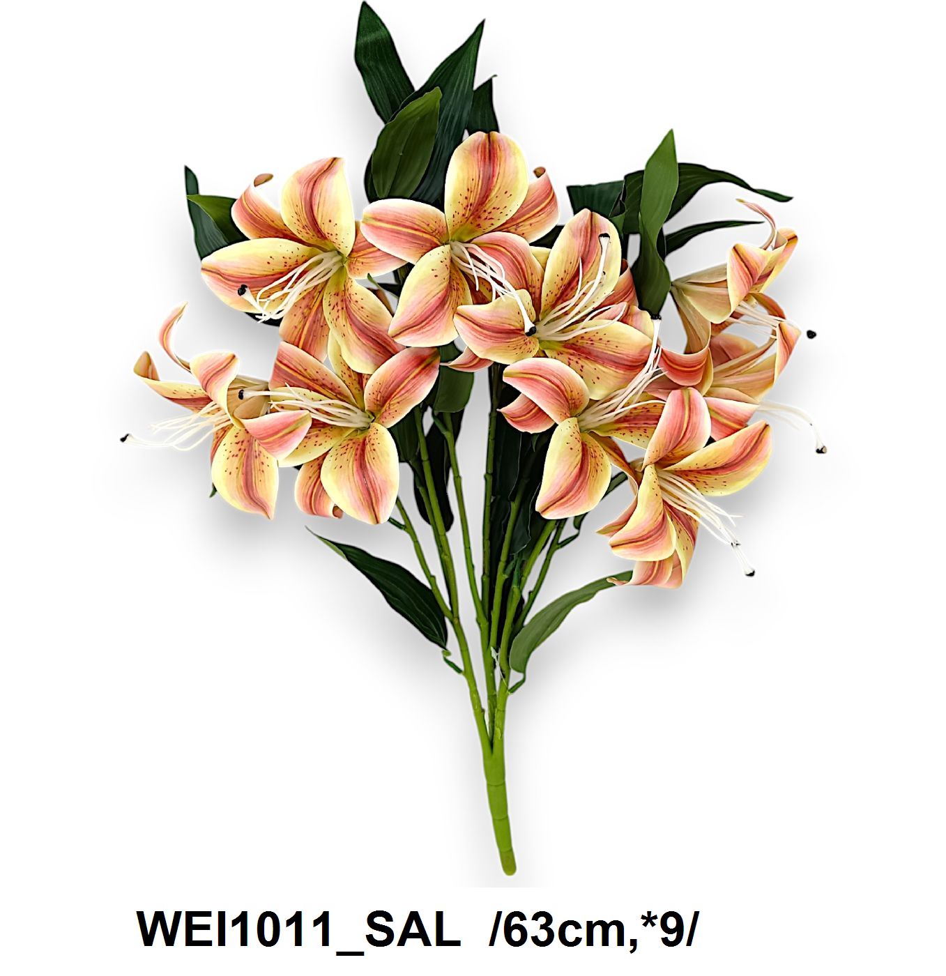 Acest buchet splendid de flutureuri artificiale îmbină frumusețea și finețea printrun design atractiv în nuanțe de somon și accente subtile de verde. Perfect pentru decoruri interioare sau evenimente, aceste flori oferă un aspect natural și durabil fără necesitatea îngrijirii specifice florilor naturale. Înălțimea totală este de 63 cm.