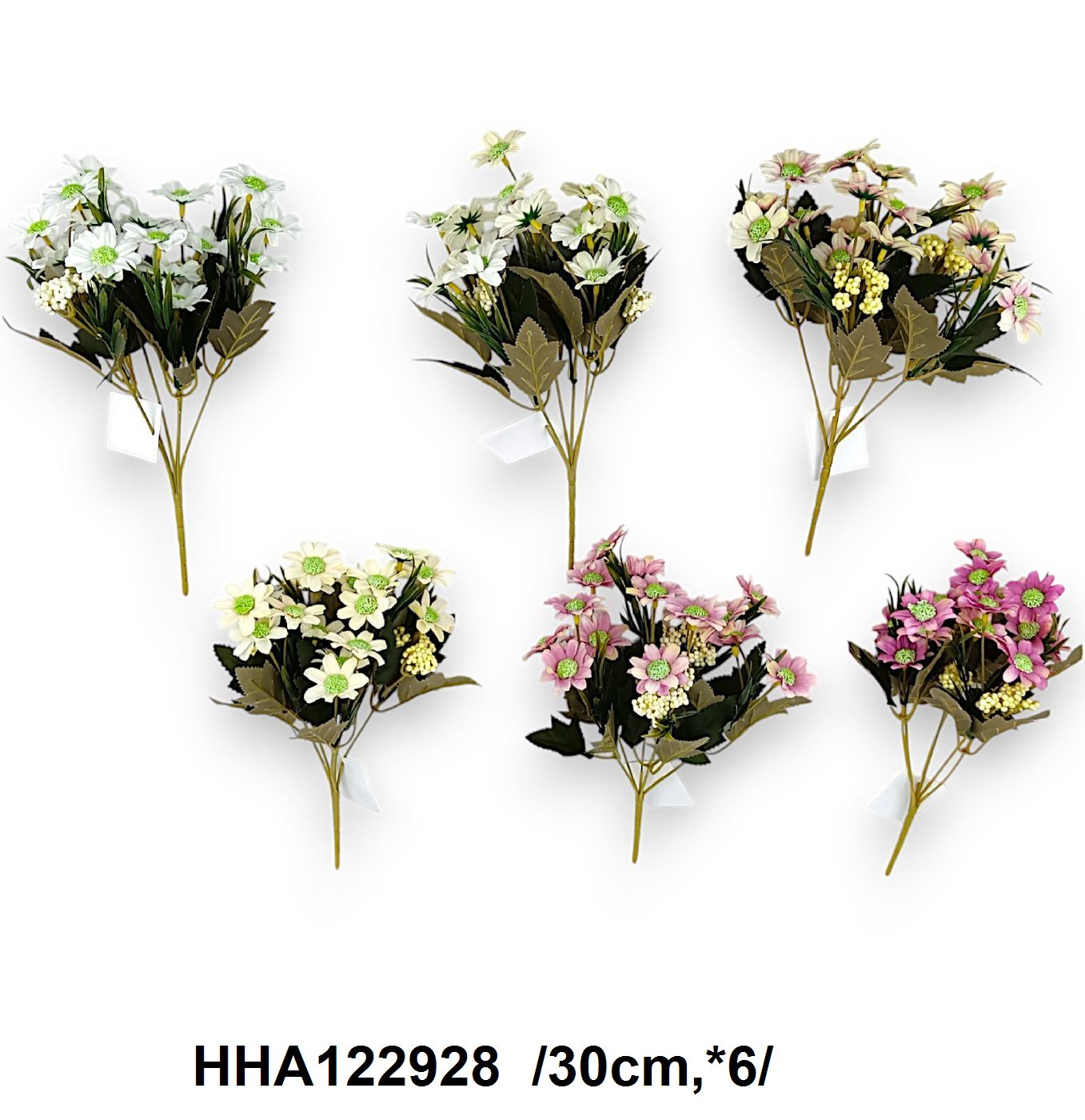 Acest buchet de flori artificiale îmbină eleganța și diversitatea, fiind compus din flori de diverse culori și tipuri, inclusiv margarete și flori de câmp, accentuate de frunze verzi