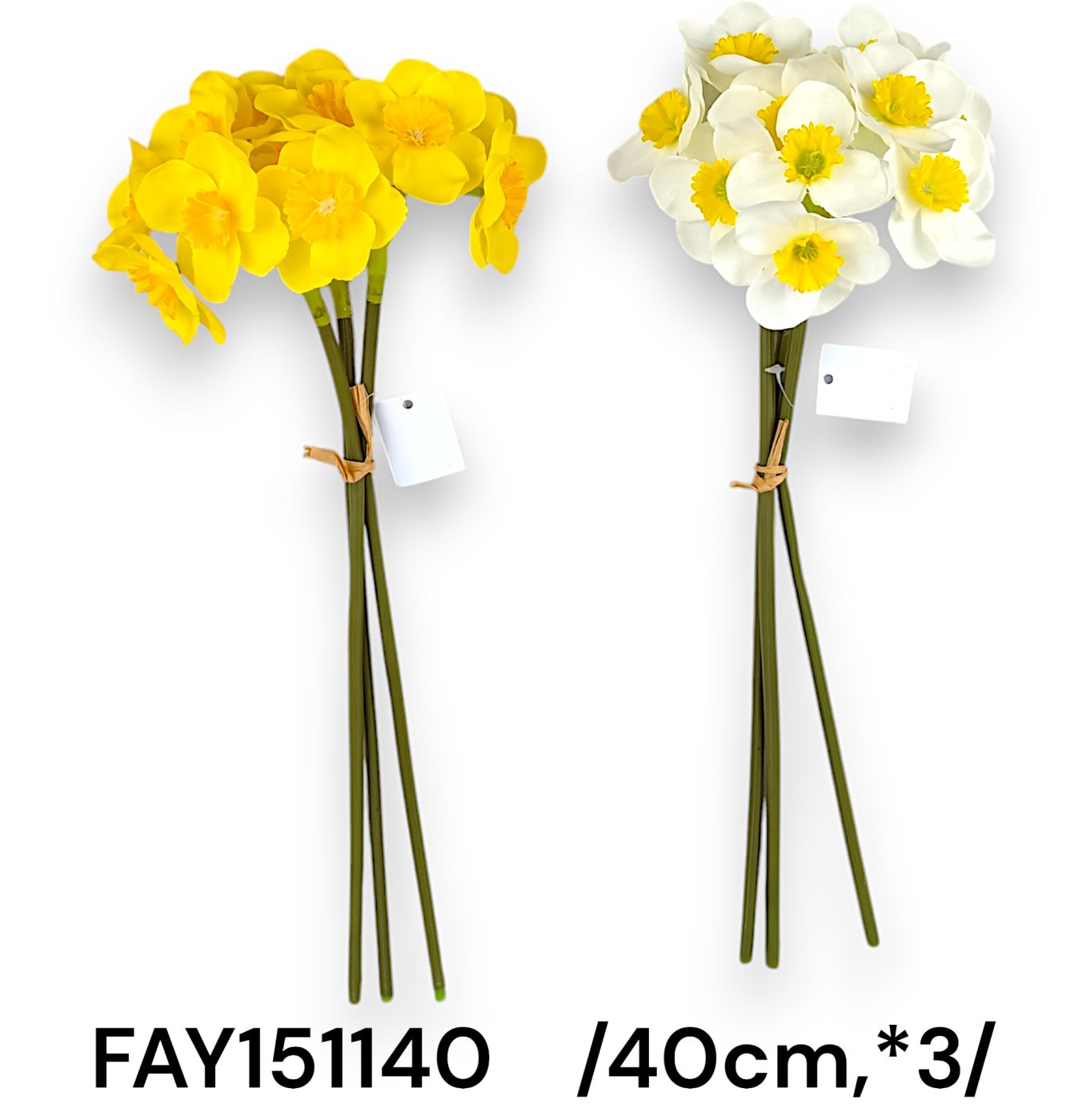 Descoperiți frumusețea acestui buchet de narcise satinate, perfect aspectuate în culori suave de crem și galben. Cu o lungime de 40 cm, aceste flori delicate adaugă un strop de eleganță și proaspătă primăvară oricărui decor.