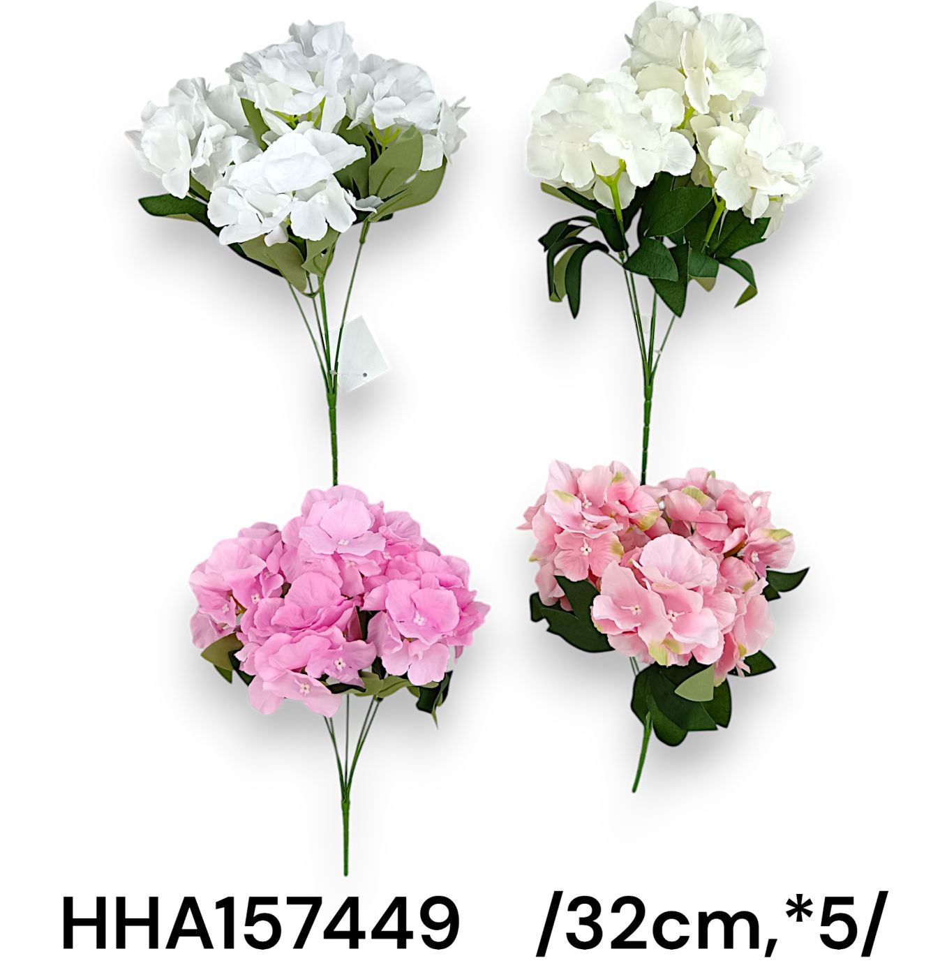Adaugă un plus de rafinament decorurilor tale cu aceste buchete artificiale de hortensie, disponibile în culori vii de alb și roz. Perfecte pentru a înfrumuseța orice spațiu, aceste flori nu necesită întreținere și își păstrează frumusețea tot anul. Dimensiune: 32 cm.