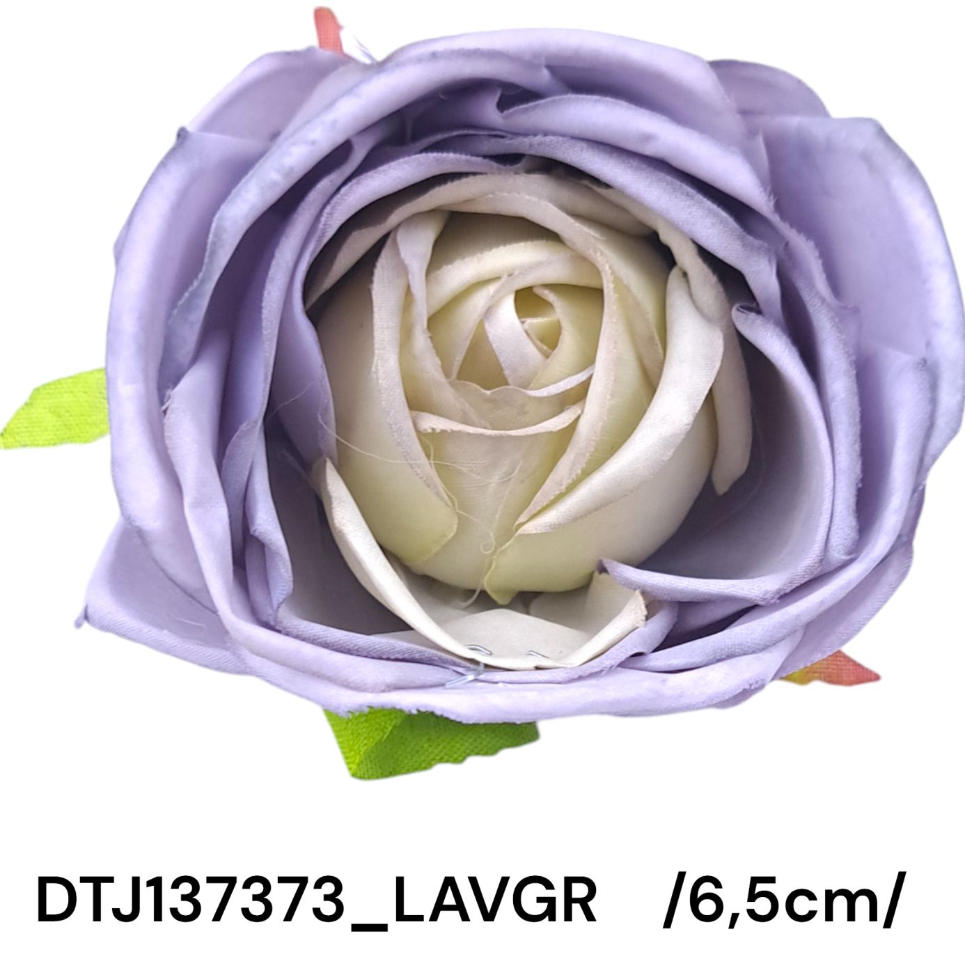 Cap de floare artificială reprezentând un trandafir, ideal pentru diverse aranjamente florale. Culoarea delicată în nuanțe de lavandă cu accente de verde conferă un aspect natural și elegant. Dimensiune aproximativă: 6,5 cm în diametru, perfect pentru décorul de interior sau evenimente.