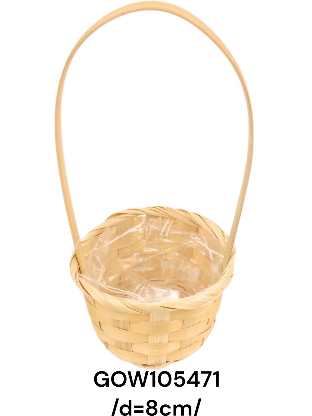 Coșuleț elegant din bambus cu diametrul de 8 cm, perfect pentru aranjamente florale sau ca element decorativ. Prevăzut cu mâner și căptușit pe interior, adaugă un farmec natural oricărei încăperi.