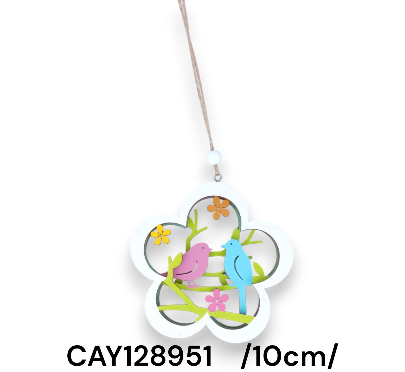 Decorațiune inovativă în formă de floare și inimă, realizată din lemn laminat, împodobită cu două păsări vesele în nuanțe de roz și albastru și flori mici, ideale pentru a adăuga un strop de culoare și natură oricărui spațiu. Dimensiune: 10 cm. Perfectă pentru decoruri primăvăratice sau pentru a aduce zâmbete în orice cameră.