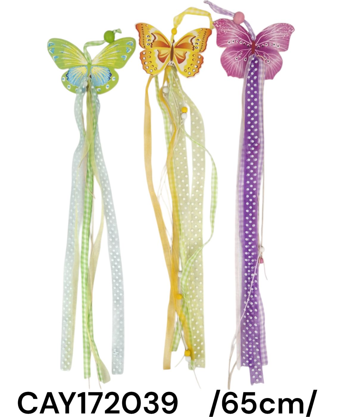 Ornament atractiv pentru ușă, reprezentând fluturi viu colorați, perfect pentru a adăuga un strop de culoare și veselie oricărui spațiu. Realizat din lemn, acest decor este accesorizat cu o panglică în dungi dotty checkered, adăugând un plus de farmec. Disponibil în trei variante de culori pastelate cu accente delicate: verde cu albastru, galben cu portocaliu și violet cu roz.