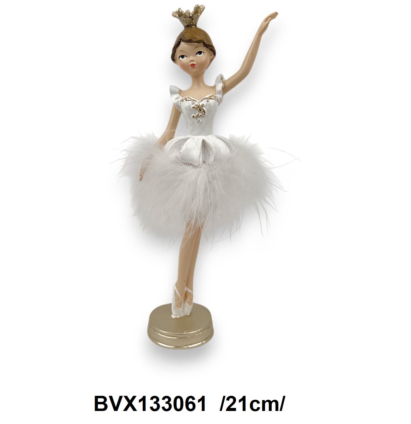 Adăugați un strop de eleganță și grație oricărei încăperi cu această figurină decorativă reprezentând o balerină. Întrun costum de balet alb, împodobit cu detalii fine și accente aurii, aceasta este perfectă pentru a înfrumuseța orice spațiu. Dimensiunea de 21cm o face ideală pentru vitrine sau mese festive.