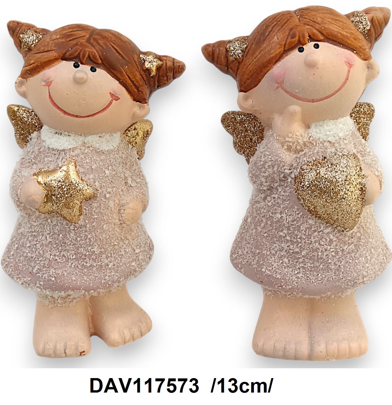Figurine de sezon sub formă de îngeri, perfecte pentru a aduce un plus de farmec în decorul festiv. Acești îngeri drăguți sunt decorati cu detalii glitter în nuanțe de auriu pe epoleți și în mână sub formă de stea, conferind o notă de strălucire. Culoarea predominantă este roz pal, ideală pentru a aduce un strop de culoare și veselie în orice încăpere.