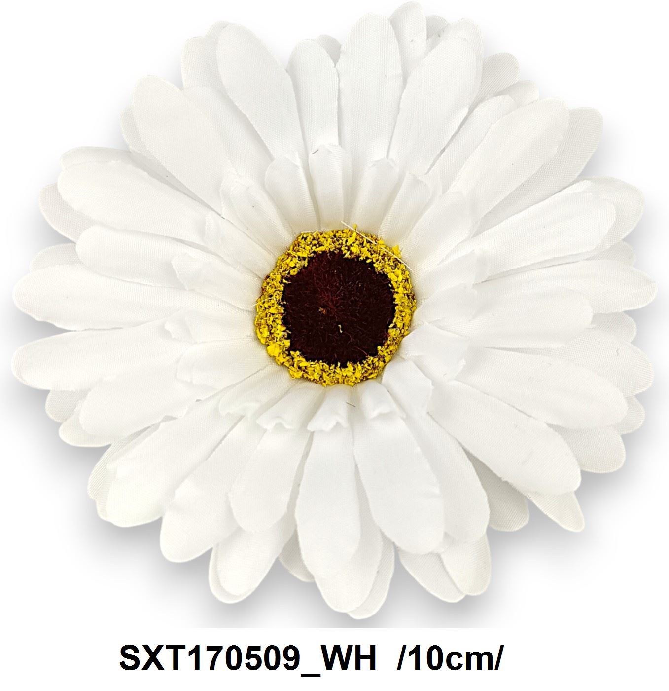 Margaretă artificială de culoare albă, cu un centru maro și detalii galbene, ideală pentru decoruri florale sau aranjamente festive. Diametru: 10 cm.