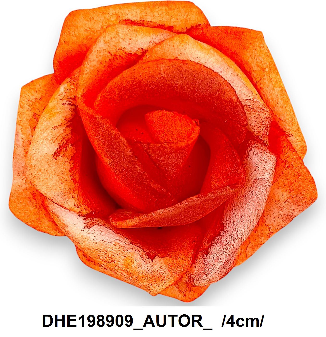 Cap de trandafir artificial, realizat cu atenție la detalii pentru a imita cât mai fidel aspectul unui trandafir natural. Ideal pentru realizarea aranjamentelor florale durabile. Culoarea vibrantă de portocaliu adaugă un accent de căldură și vitalitate oricărui spațiu.