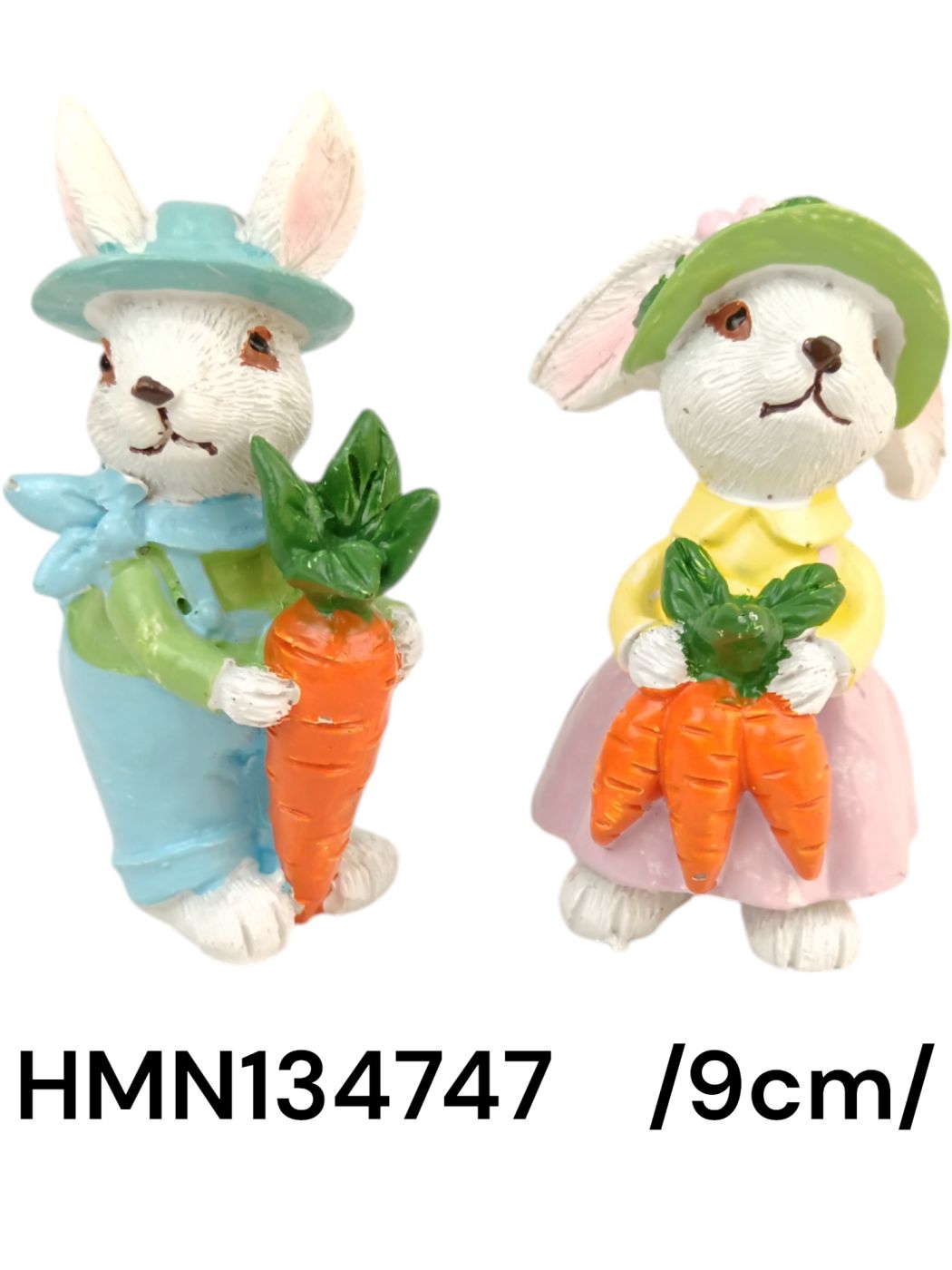 Adorabil iepuraș din polirăsină, perfect pentru decor de Paște. Fiecare figurină deține un morcov vioi și poartă o pălărie colorată, adăugând o notă veselă oricărui spațiu. Dimensiunea de 9 cm o face ideală pentru aranjamente mici pe birou sau rafturi.