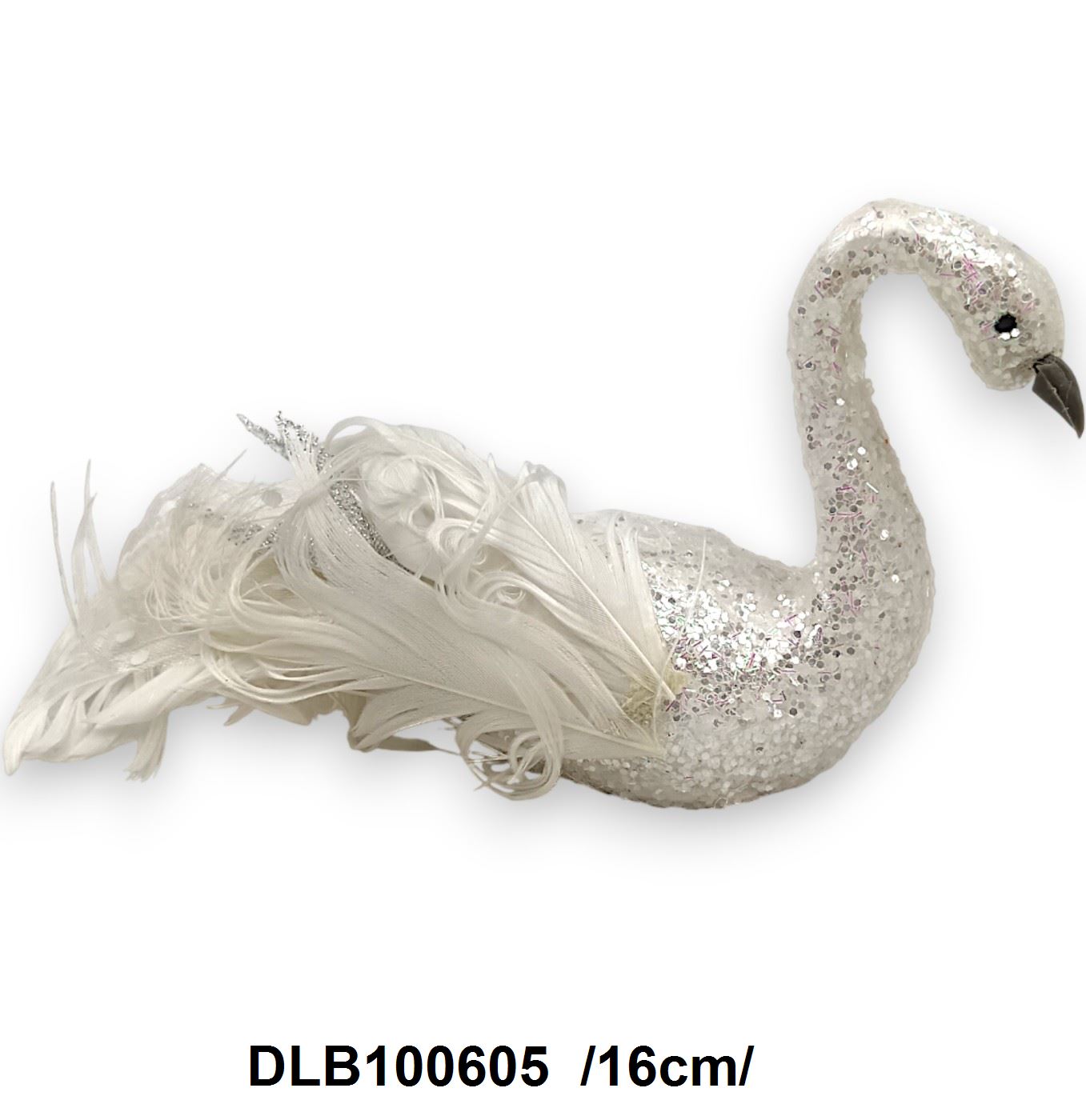Această frumoasă lebădă decorativă este acoperită cu pene albe și detalii strălucitoare din paiete