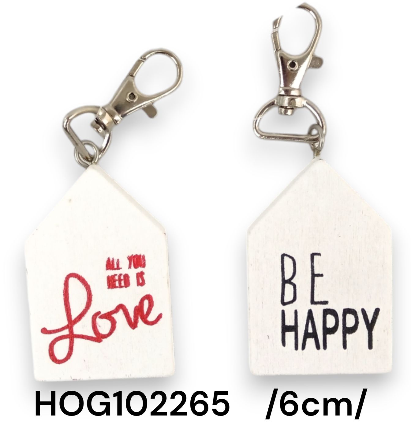 Adaugă un strop de inspirație zilnică cu acest ornament de cheie din lemn de 6 cm, perfect pentru ați organiza cheile întrun mod stilat. Fiecare piesă prezintă o inscripție atrăgătoare una cu mesajul ‘All you need is Love’ în culoare roșu și cealaltă cu ‘Be Happy’ în negru, ambele pe un fond alb natural, ce adaugă un contrast plăcut și un sentiment cald oricărui spațiu.