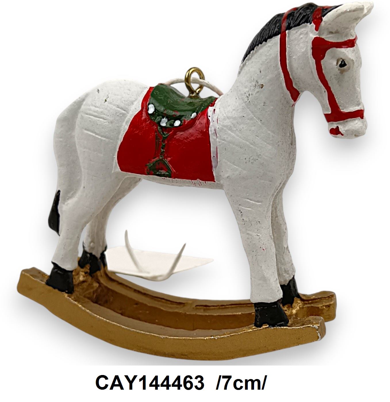 Decoreazăți spațiul cu un farmec festiv folosind acest ornament de Crăciun în formă de cal pe balansoar. Realizat cu atenție la detalii, acest cal este pictat în alb, cu accente de roșu și negru, frumos accentuat cu detalii aurii pe balansoar, aducând o notă de eleganță sărbătorilor.