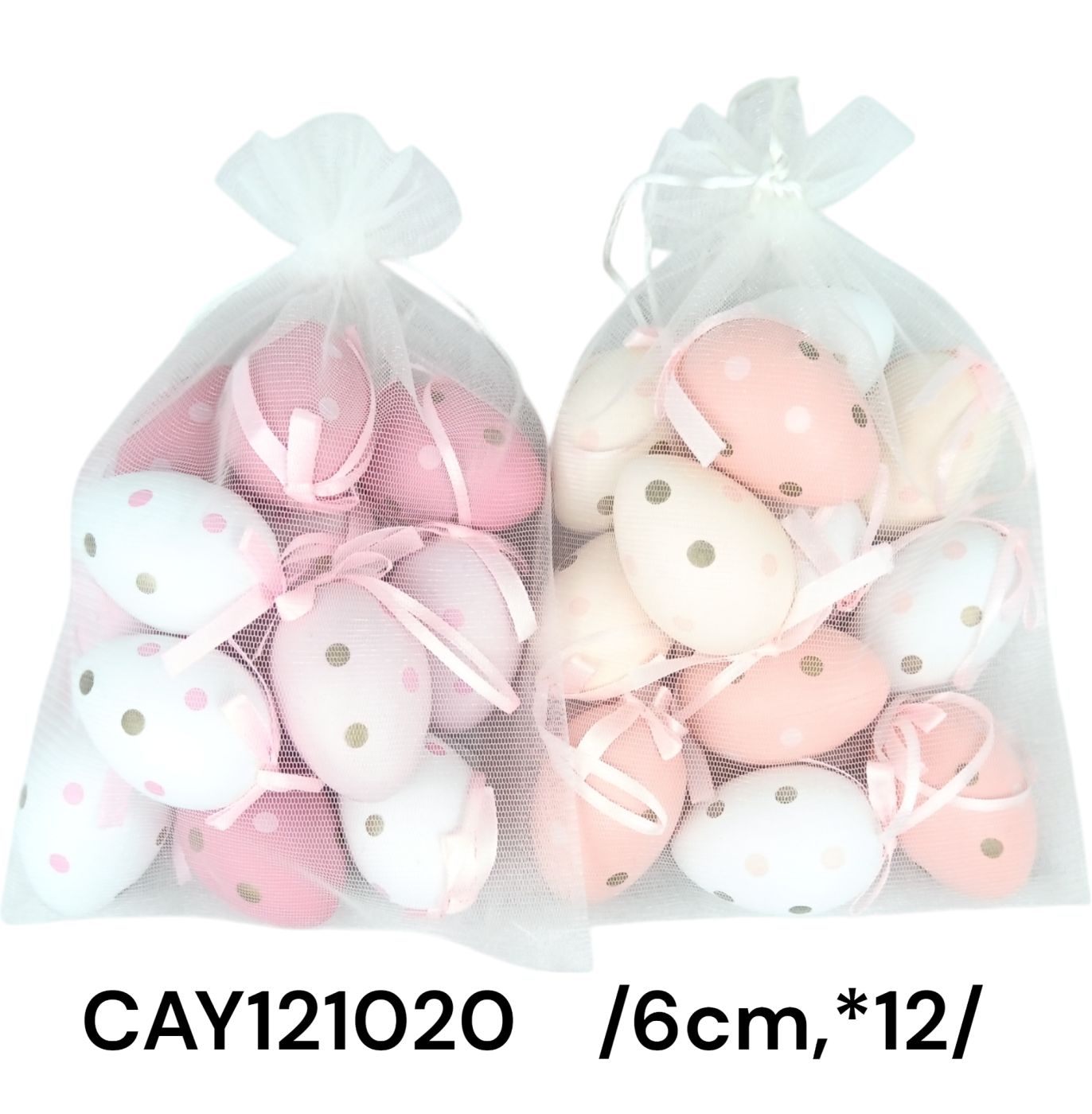 Adăugați un strop de eleganță sărbătorilor pascale cu aceste ouă decorative de 6 cm, ornate cu buline aurii, argintii și albe. Ideale pentru decorul de sărbători, aceste ouă vin întro varietate de culori suave și sunt prezentate întrun sac de plasă atrăgător.