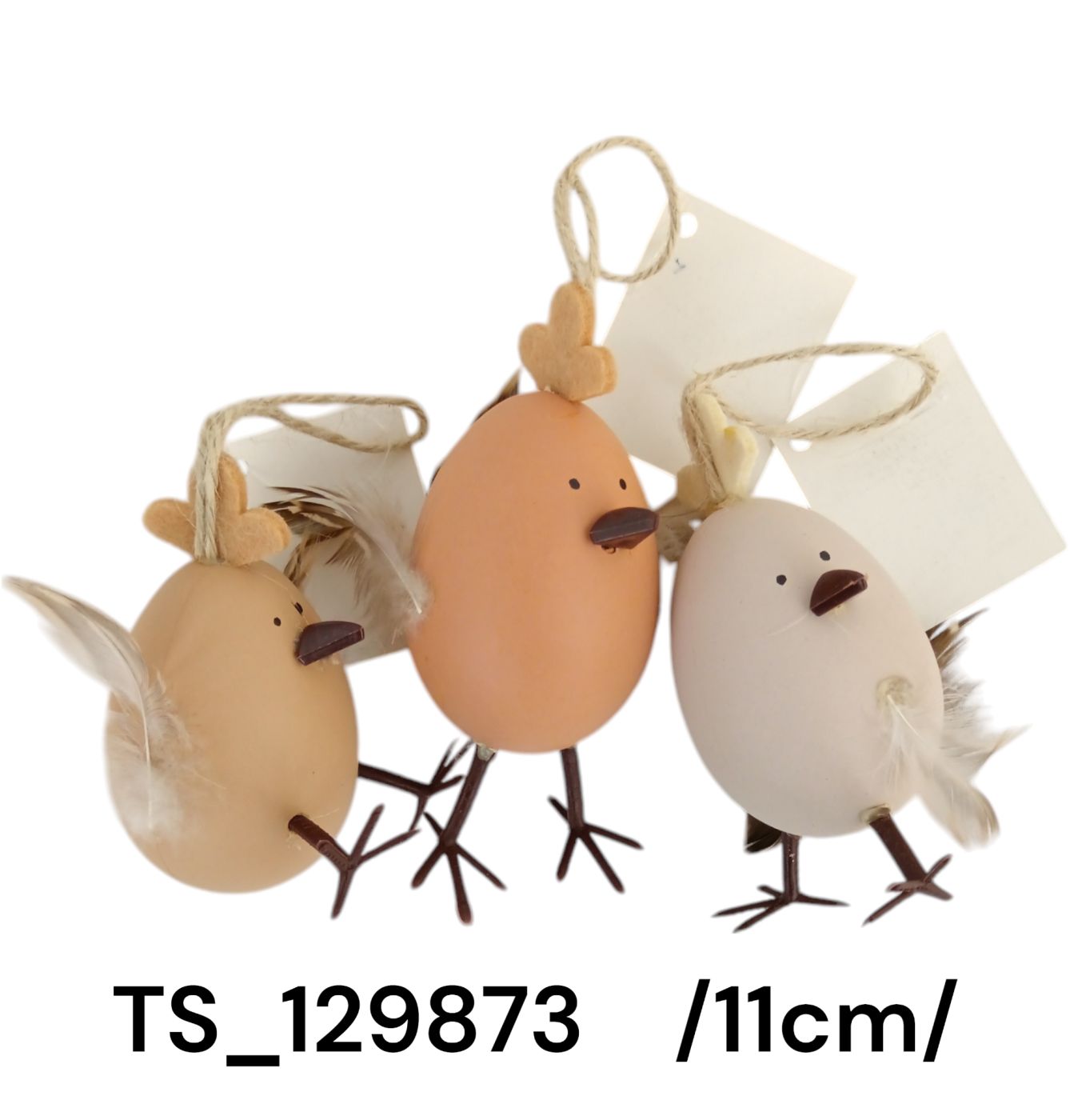 Adaugă un strop de veselie și originalitate decorurilor tale de Paște cu aceste păsări decorative agățătoare! Realizate meticulos cu corp în nuanțe delicate de bej și crem, aceste ornamente sunt prevăzute cu pene subtile pentru un efect vizual plăcut și cu agățători din sfoară naturală, perfecte pentru a fi suspendate în diferite locuri în casa ta