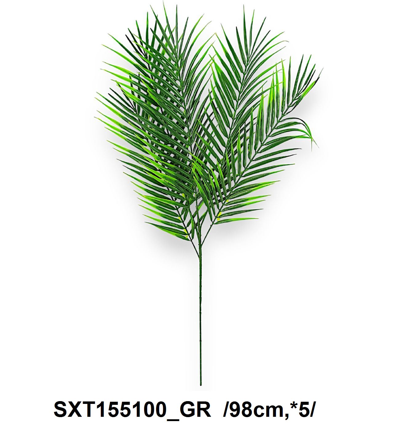 Ramură artificială de palmier, perfectă pentru a adăuga un strop de exoticism în orice aranjament floral sau decor. Cu o lungime impresionantă de 98 cm și un colorit verde intens, această ramură aduce prospețimea naturii în spațiul tău, fără necesitatea întreținerii. Ideală pentru decoruri interioare, evenimente sau ca parte din compoziții florale.