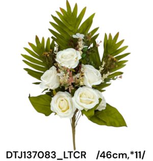 Acest semibuchet fermecător este format din trandafiri artificiali de culoare roz, decorativi și delicati, însoțiți de 11 bace de plastic și frunze mari de culoare crem deschis. Perfect pentru decorarea oricărui spațiu, aducând un strop de eleganță și proaspăt.