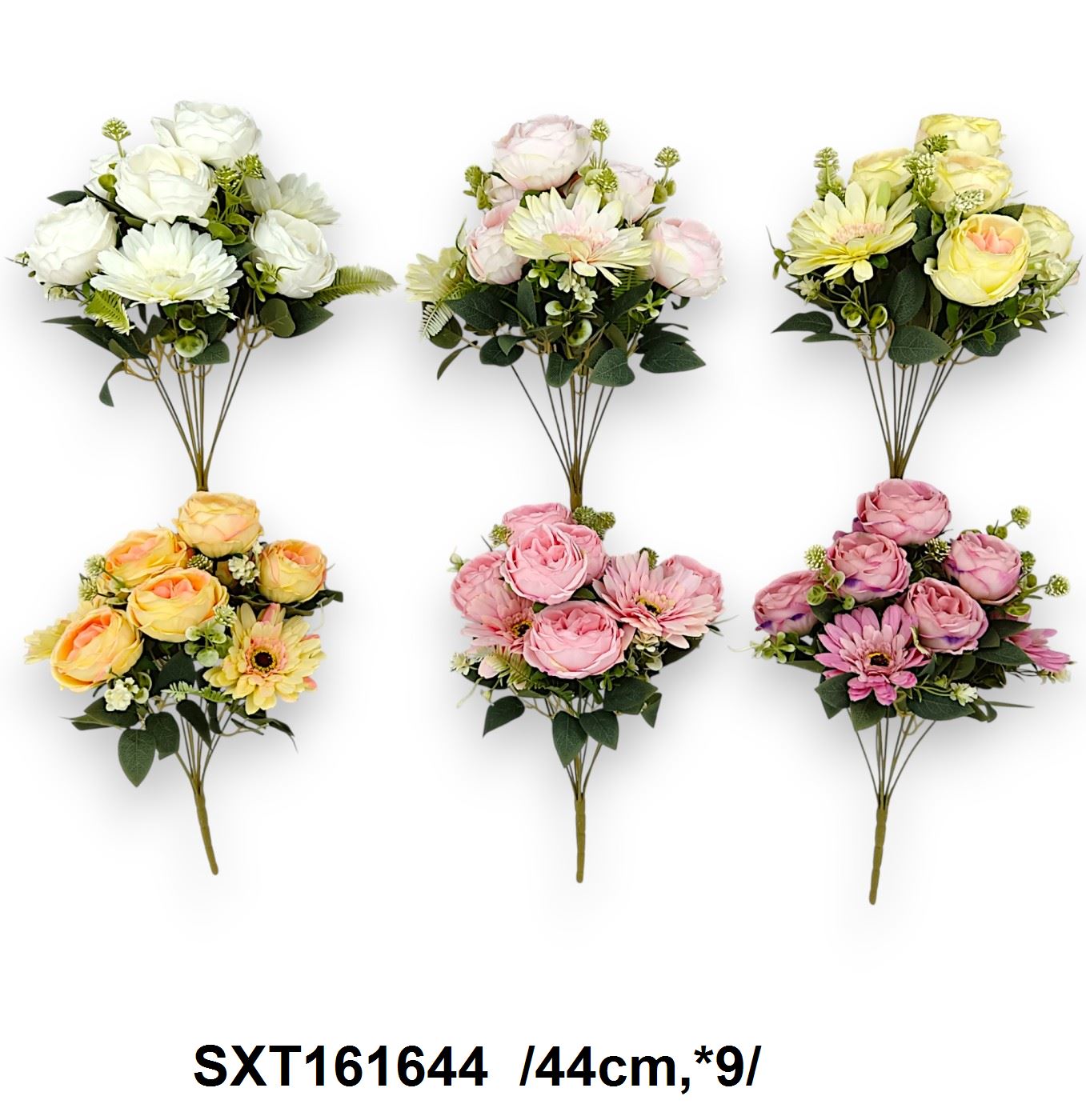 Buchetele artificiale, diverse și viu colorate, perfecte pentru decorațiuni interioare și aranjamente festive. Fiecare buchet este alcătuit dintro varietate de flori, incluzând trandafiri și gerbere, în tonuri de roz, galben și alb, adăugând un strop de culoare și eleganță oriunde sunt expuse.