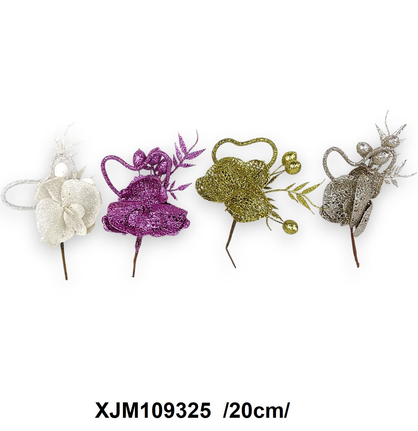 Adu un strop de strălucire în aranjamentele tale florale cu acest set de capete de flori decorative. Disponibile întro paletă variată de culori: alb, mov, verde și argintiu, aceste ornamente sunt perfecte pentru a adăuga un element festiv și elegant. Fiecare floare are o lungime de 20 cm și este împodobită cu detalii sclipitoare, ideale pentru sărbătorile de iarnă sau orice eveniment special.