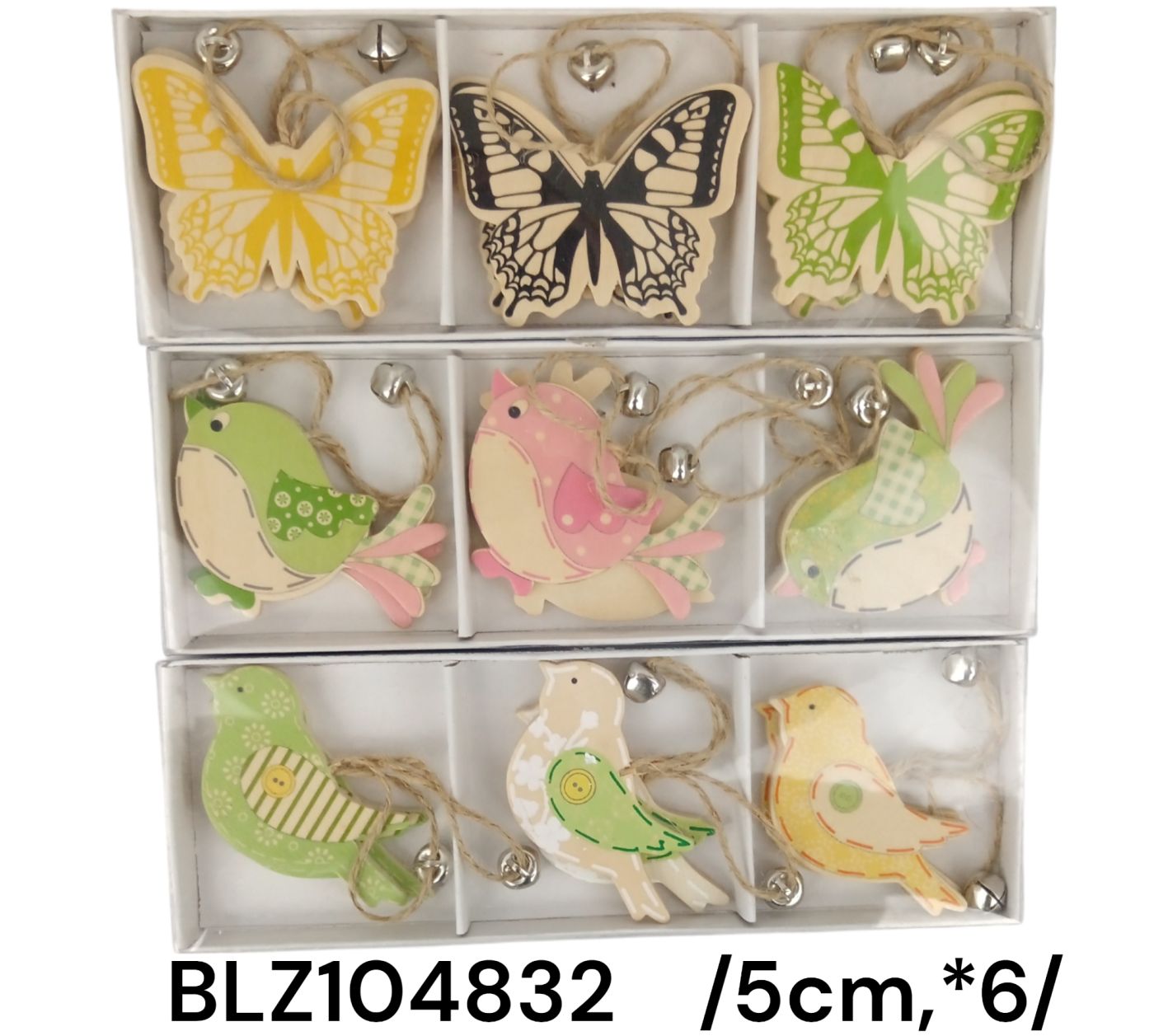 Descoperă setul nostru unic de agățătoare decorative, perfecte pentru a aduce un strop de culoare și veselie în orice spațiu. Fiecare cutie conține șase figurine din lemn, reprezentând fluturi și păsărele, toate colorate și dotate cu un clopoțel pentru un plus de farmec. Aceste decorații sunt ideale pentru accesorizarea spațiilor interioare, oferinduvă o modalitate simplă dar efectivă de a personaliza decorul.
