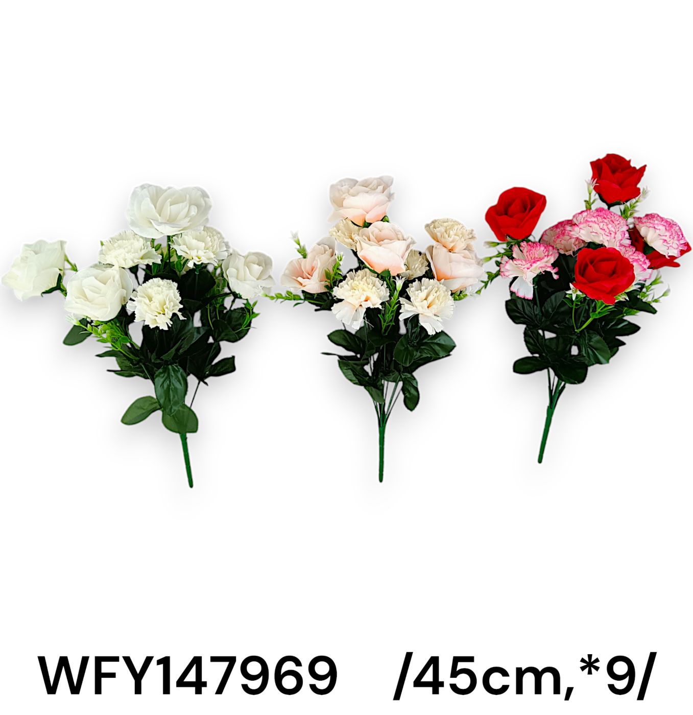 Descoperă eleganța atemporală cu acest set de trei buchete de flori artificiale, perfect pentru orice decor interior. Fiecare buchet cuprinde o combinație armonioasă de trandafiri și garoafe, în nuanțe variate de alb, roz pal și roșu intens. Florile sunt realizate din material plastic de calitate, oferind un aspect realist și o durabilitate îndelungată. Ideal pentru aranjamente florale deosebite la evenimente sau ca decor acasă.