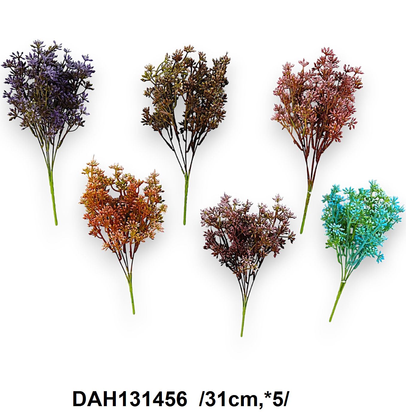 Acest set include cinci tipuri de flori artificiale în diferite culori, perfecte pentru adăugarea unei note de culoare și textură oricărui aranjament floral. Fiecare floare are o înălțime de 31 cm, prezentând nuanțe variate de mov, maro, portocaliu, roșu bordo și albastru deschis. Ideale pentru decoruri sezoniere sau pentru a aduce un strop de prospețime în orice spațiu interior.