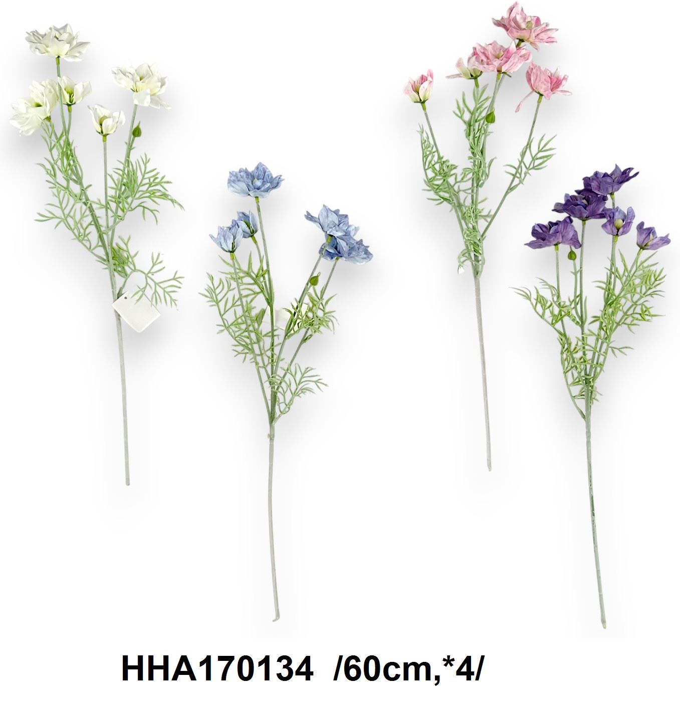 Acest set de flori artificiale adaugă o notă de eleganță oricărui spațiu. Compus din patru tulpini, fiecare având diferite nuanțe pastelate de albastru, roz și alb, perfecte pentru aranjamente florale de sezon sau decoruri permanente.