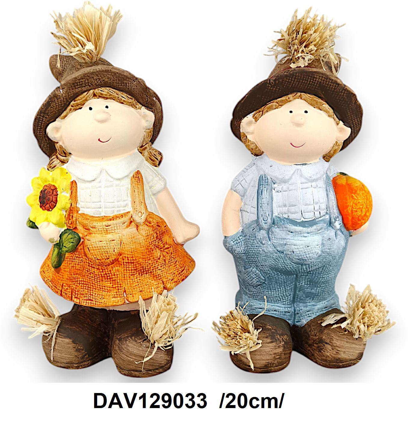 Adu farmecul rustic al anotimpului recoltei în casa ta cu acest set de figurine decorative îmbrăcate în haine de toamnă. Realizate cu detalii fine, una dintre figurine poartă o rochie portocalie și ține o floare de soare, iar cealaltă este îmbrăcată în salopetă albastră cu un dovleac portocaliu.