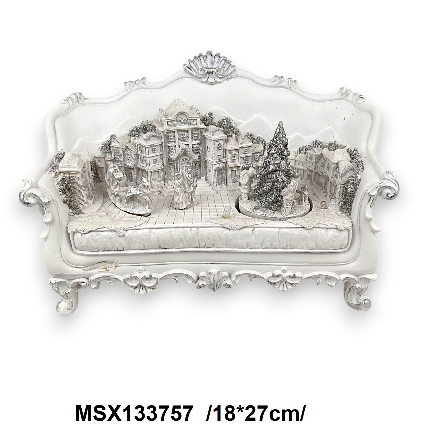 Capturați spiritul sărbătorilor cu acest tablou decorativ de Crăciun, prezentând un peisaj urban detaliat în nuanțe de alb. Designul clasic, împodobit cu scene festive de iarnă și cadre naturale, adaugă o notă de eleganță oricărui spațiu. Perfect pentru decorarea casei sau pentru a fi oferit cadou în sezonul sărbătorilor. Dimensiuni: 18×27 cm.