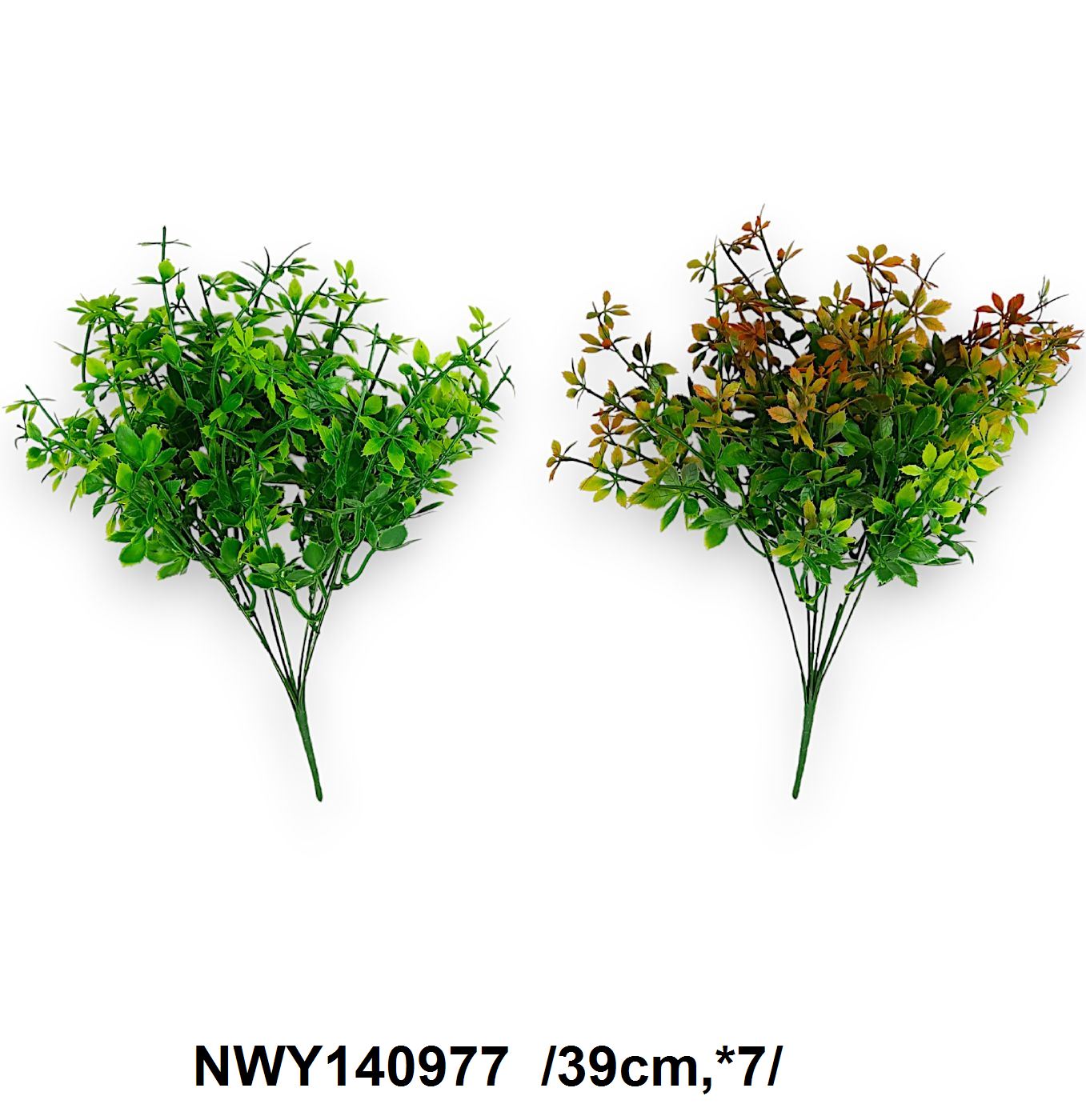 Buchet decorativ format din 7 tufișuri mici cu frunze verzi și nuanțate de toamnă, realizate din plastic de înaltă calitate, cu margini zigzag pentru un aspect natural. Perfect pentru decorarea spațiilor interioare sau pentru completarea aranjamentelor florale.