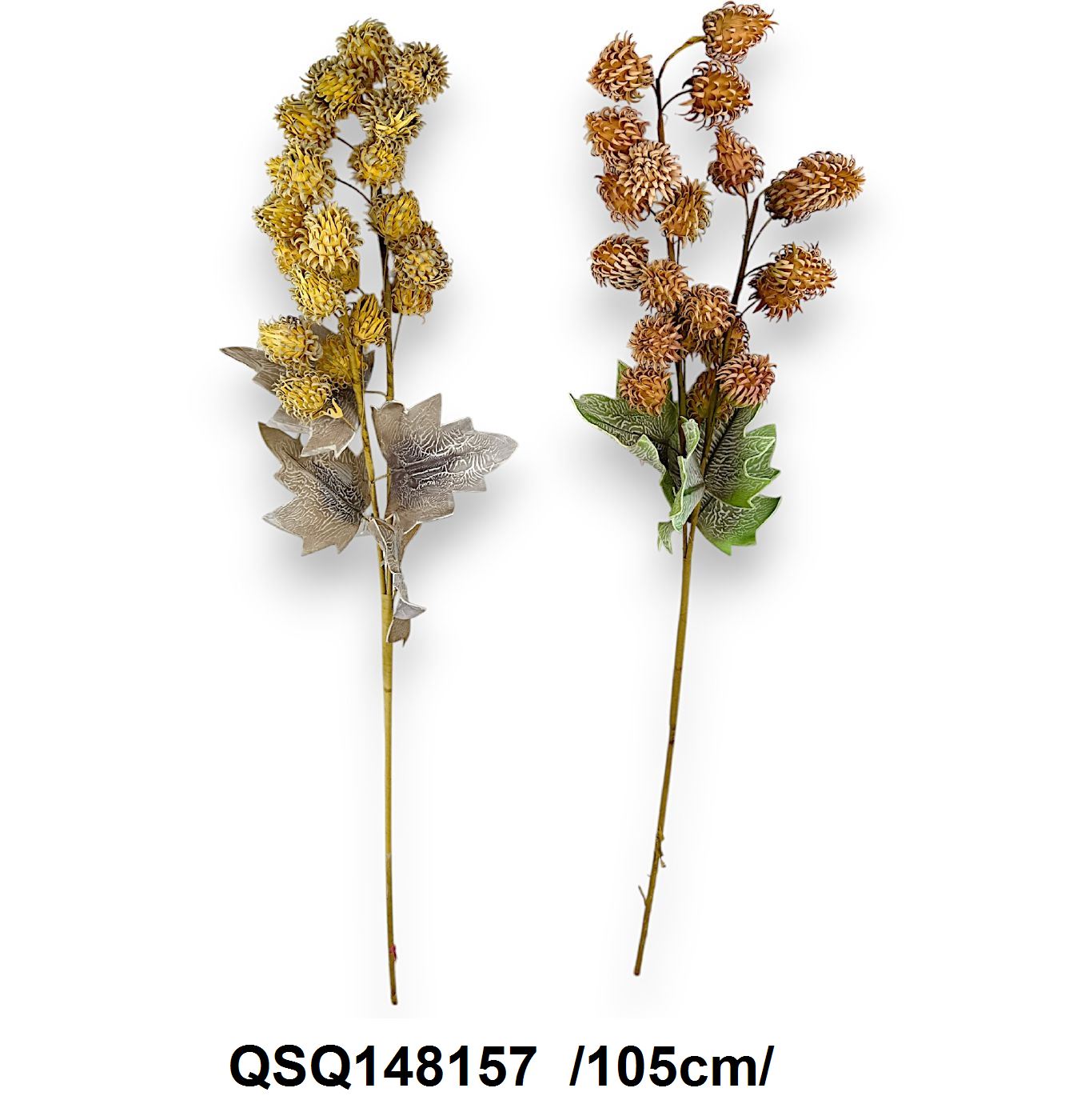 Adaugă o notă de eleganță și căldură toamnei în decorul tău cu aceste tulpini decorative, perfecte pentru aranjamente florale sau ca elemente decorative în vaze. Tulpinile sunt împodobite cu frunze și flori uscate în nuanțe de auriu și bronz, conferind un aspect natural și rafinat.